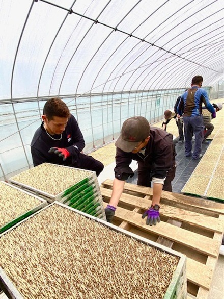 みんなで苗出し。プール育苗で育てます。